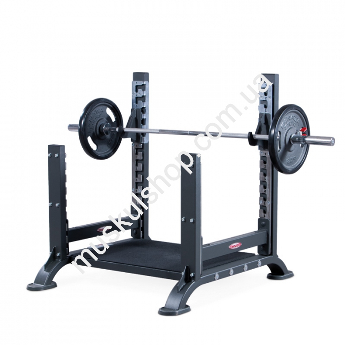 Тренажер оборудован регулируемыми по высоте подставками под штангу.