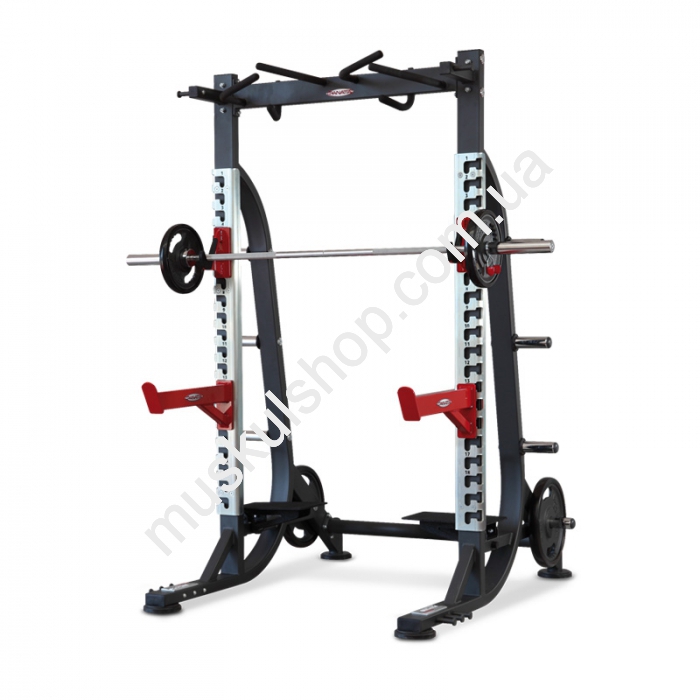 Тренажер оборудован ступенькой для страхующего помощника и консолями под весовые блины для штанги.