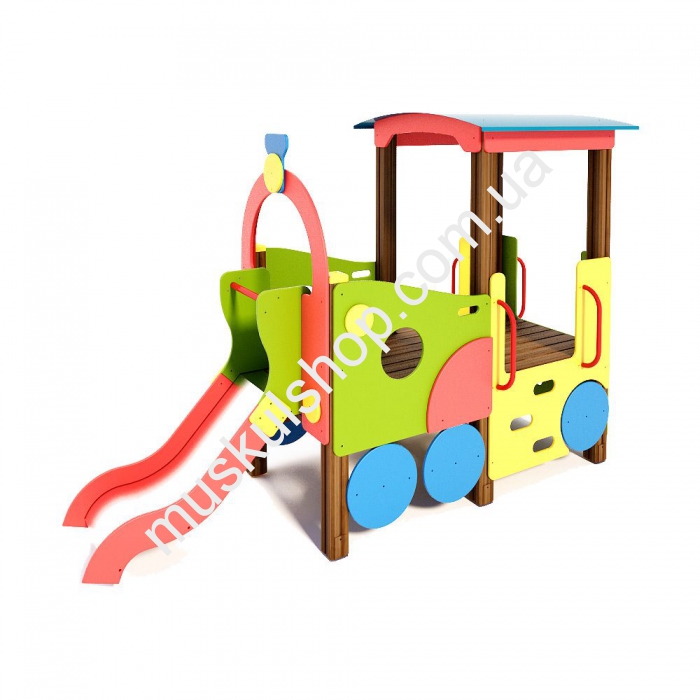 Паровозик с горкой Интер Атлетика T502 представлен в виде детского паровозика, придется по душе не только мальчикам, но и девочкам. Игровой комплекс представлен в разноцветных тонах, выполнен с прочного, качественного и натурального дерева, с добавлением стали и фанеры. Общая масса изделия составляет 221,6 кг, способно выдержать общую массу в 80 кг, идеальный вариант для детишек от 2-х до 7 лет, устанавливается в помещениях, дачах и загородных комплексах, базах отдыха, детских лагерях, возле водоемов. Для лучшей фиксации комплекса, необходимо забетонировать основание. Материалы качественные и после нескольких годов интенсивной эксплуатации, такая детская горка не поменяет свой первоначальный облик. Оснащен паровозик всем необходимым, а именно поручнями во время поездок и поднятия, а также горкой для крутого и молниеносного спуска.