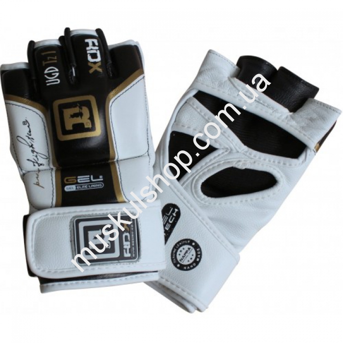 Перчатки RDX для ММА одна из лучших моделей в своей линейке, которая выполнена из качественной, прочной и эластичной кожи типа Nappa. Перчатки хорошо подходят для оттачивания ударов, техники броска и захвата турника. Они призваны обеспечить самый лучший комфорт и безопасность, обладая при этом бесподобными ударными свойствами. Перчатки пошиты ручным способом, набивка из геля. Перчатки, благодаря своему дизайну обретает форму руки, не скользят и не слетают в момент интенсивных тренировок. Модель хорошо адаптирована под узкое запястье спортсмена, в наличии разные размеры, под заказ. Ремешок на липучке напрочно зафиксирует перчатку на запястье, даже на тонкой руке, представлена в золотистом цвете.