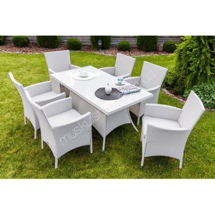 Садовая мебель ротанг Di Volio Trapani 7 white это эксклюзивная экологическая мебель из ротанга для самых требовательных клиентов, которые ценят комфорт, роскошь и элегантность. Ротанг имеет много преимуществ в виде устойчивости к изменению погодных условий, износостойкости и возможности выдерживать большие нагрузки. Вам не придется прятать представленную мебель во время дождя, поскольку материал не будет поглощать влаги. Садовая мебель ротанг Ди Волио Трапани 7 вайт легко поддается очистке от пыли, грязи и другого типа загрязнений при помощи обычной воды и мыла, или другого моющего средства. В качестве основы для представленного комплекта мебели используется металлическая основа, обеспечивающая устойчивость и прочность. В комплекте к мебели идут мягкие подушки, что пропитаны тефлоном и имеют замки для легкой стирки внешней поверхности.