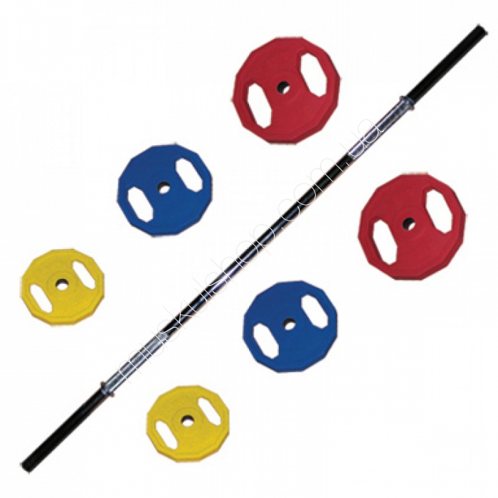 -3 пары обрезиненных дисков весом 1,15 кг (синие), 2,3 кг (желтые), 4,5 кг (красные)