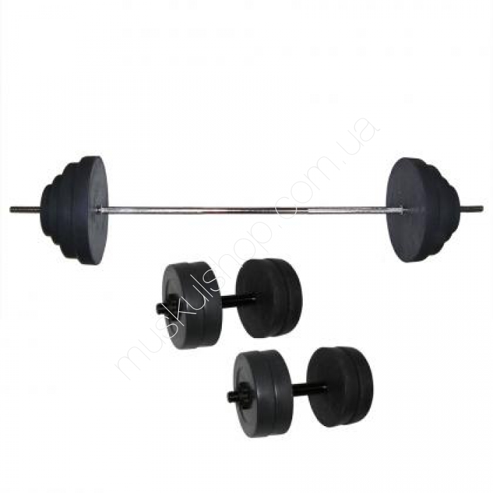 Общий вес: штанги - 90 кг, гантелей - 2х10 кг