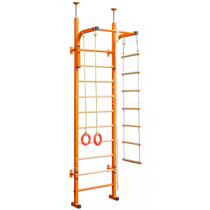 Шведская стенка Львенок GSI-sport ШС-1 разработана специально для детей и подростков. Благодаря насыщенной комплектации она позволяет выполнять широкий круг атлетических упражнений, которые будут способствовать выработке физической силы и ловкости тренирующегося ребенка. Базовая комплектация изделия включает в себя следующие спортивные снаряды: шведская лестница; турник; гимнастические кольца; веревочная лестница; канат хлопчатобумажный длинной 1,8 м. Основа конструкции шведской стенки выполнена из стального профиля 40х40 мм. Перекладины выполнены из стальных труб и дерева (бук) диаметром 27 мм. Стальные элементы конструкции имеют полиэфирное покрытие оранжевого цвета. В сочетании с деревянными элементами изделия такое цветовое решение будет хорошо гармонировать с интерьером любого помещения. Конструкция шведской стенки позволяет закрепить ее следующими способами: к стене при помощи 4-х специальных кронштейнов; в потолок при помощи потолочных распорок (при высоте потолков в диапазоне от 2,45 до 2,72 м); комбинированным креплением к стене и в потолок.
