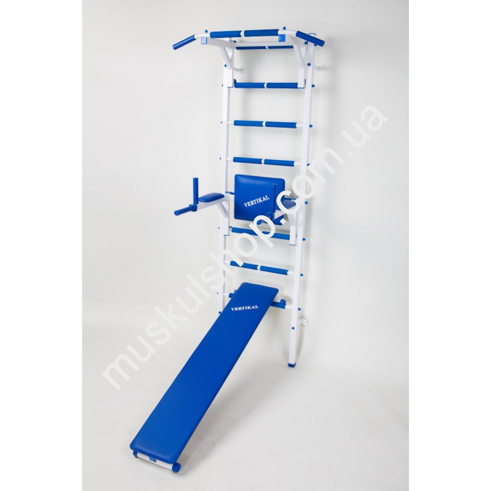 Основная стандартная часть - это лестница и скамья, выполненные в бело - синем цвете. Стенка имеет ровный порошковый прокрас, мягкие части сделаны из поролона толщиной 2,5 см. обтянутые качественным кожезаменителем. Шведская стенка VERTICAL - 3 доукомплектовуется сьемными снарядами: турником с узким и широким параллельным хватом и брусьями для пресса и отжиманий со спинкой 2 в 1. Занятия на шведской стенки благотворно влияют на вестибулярный аппарата, укрепляют мышцы опорно-двигательной системы, улучшают координацию и осанку. Очень полезным для позвоночника будет регулярное вытягивание - простым подходом в свободном провисании на руках. На скамье посильно выполнять всевозможные тренировки для реабилитации и оздоровления спины, занятия на пресс, скручивание, также упражнения с гантелями для рук.