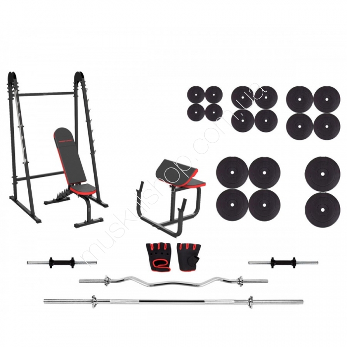 В наборе: скамья Marbo Sport MS-L101 + многоуровневые стойки под штангу MH-S104 + парта Скотта MH-L105 + перчатки + штанга 178 кг