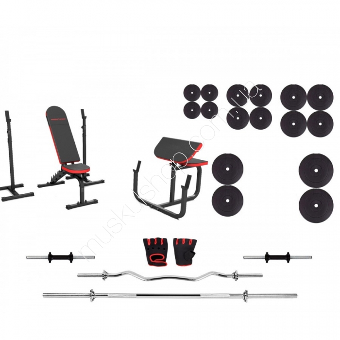 В наборе: скамья Marbo Sport MH-L114 + стойки под штангу MH-S001 + скамья Скотта MH-L105 перчатки + штанга 142 кг