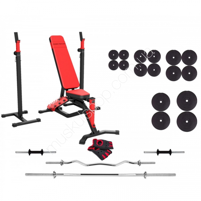 В наборе: скамья Marbo Sport MS-L101 + стойки под штангу MS-S101 + перчатки + штанга 143 кг