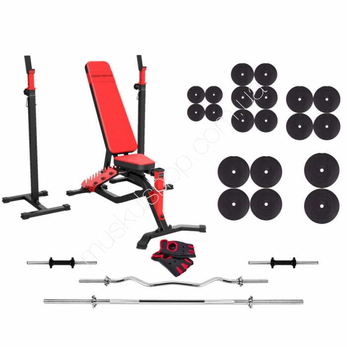 В наборе: скамья Marbo Sport MS-L101 + стойки под штангу MS-S101 + перчатки + штанга 168 кг