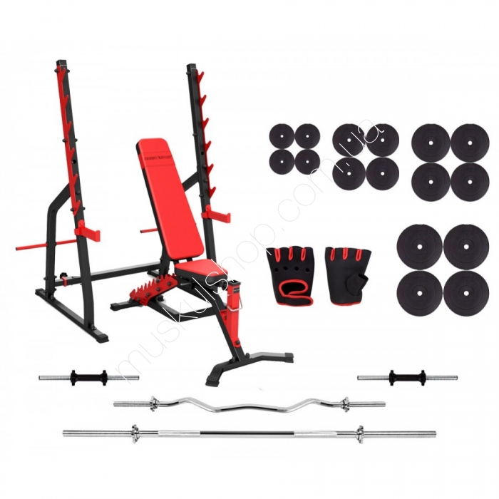 В наборе: скамья Marbo Sport MS-L101 + многоуровневые стойки под штангу MS-S107 + перчатки + штанга 152 кг