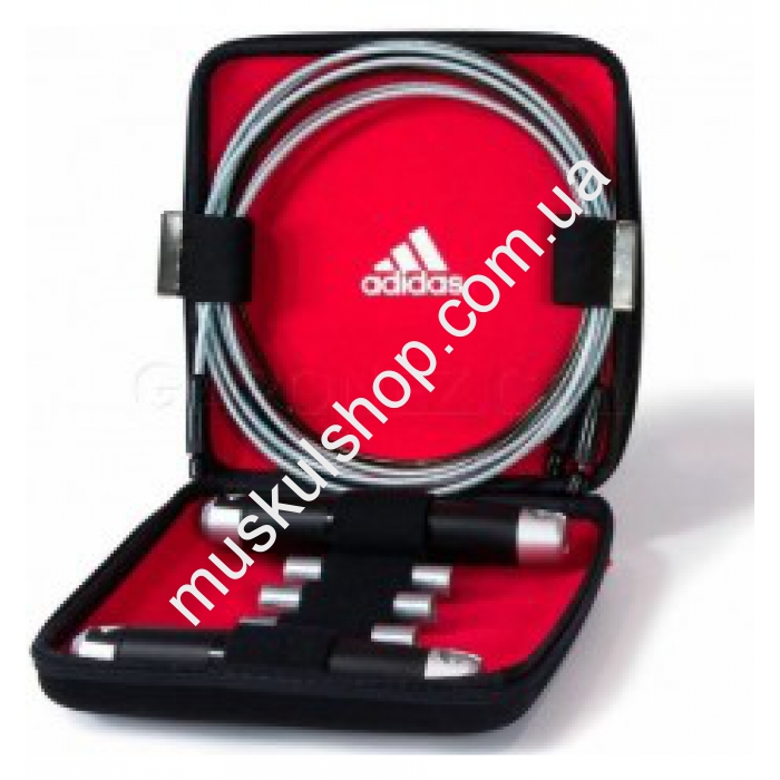 Скакалка Adidas выделяется наличие сразу нескольких утяжелителей, которые крепятся к ручке. В комплекте идет 2 шт. по 50 грамм и 2 шт. по 100 грамм. Скакалка элитного типа, выполнена с тросов различной нагрузки, обвита в нейлон. Общая длина модели составляет 272 см, в ручках предусмотрены шариковые подшипники, которые нивелируют запутывание скакалки в момент прыжков, она регулируется также по длине. В момент тренировки задействованы много групп мышц, такие как брюшного пресса, ягодиц, кисти рук, ладони, икроножные и спинные. Модель рассчитана на профессиональных пользователей. Для удобной транспортировки и компактности всех изделий предусмотрен кейс.