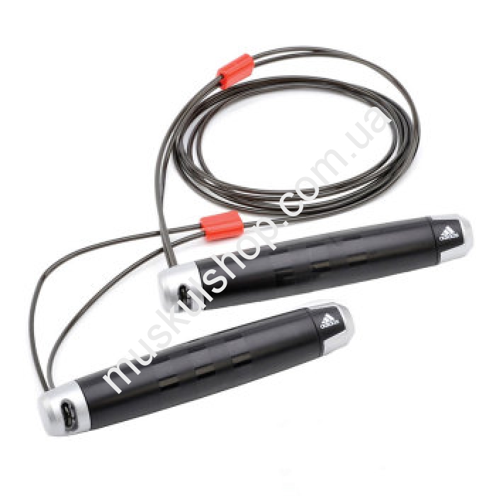 Скакалка Adidas разработана для профессиональных пользователей, отличается большой динамичностью, общий вес которой едва превышает 300 грамм. Скакалка также подходит для занятий на природе и домашних условиях, спортзале. Изюминкой модели является ручка, где находятся специальные подшипники. На ручке предусмотрено рельефное нанесение, чтобы они не выскальзывали во время интенсивных тренировок. Выполнена скакалка из прочной резины, а ручки из пластика, представлена в строгом черном цвете, общая длина скакалки данной модели составляет 280 см. Данный инвентарь увеличивает ловкость рук, скорость мышц, эластичность и повышает выносливость организма. В момент тренировки задействованы много групп мышц, такие как брюшного пресса, ягодиц, кисти рук, ладони, икроножные и спинные. Скакалка регулируется по длине.