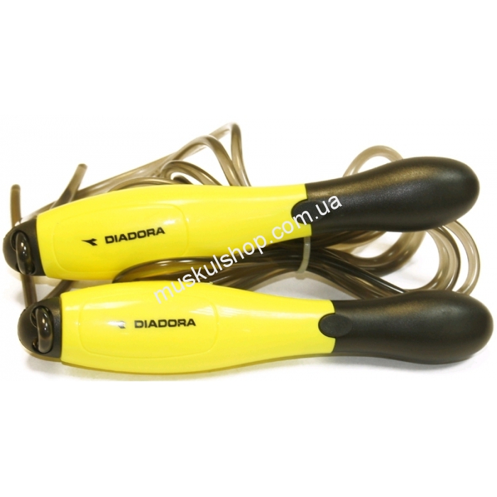 DiadoraСкакалка Diadora A-0136JR50Скакалка с регулируемым силиконовым шнуром Diadora A-0136JR50 невероятно удобна и прочна, а потому может быть использована хоть целый день без перерывов. Данное приспособление может использоваться для занятий фитнессом и аэробикой, или же просто для прыжков. Скакалка весьма популярна среди женской половины пользователей, поскольку способствует поддержанию красивой фигуры. Она также помогает натренировать мышцы ног и кисти.