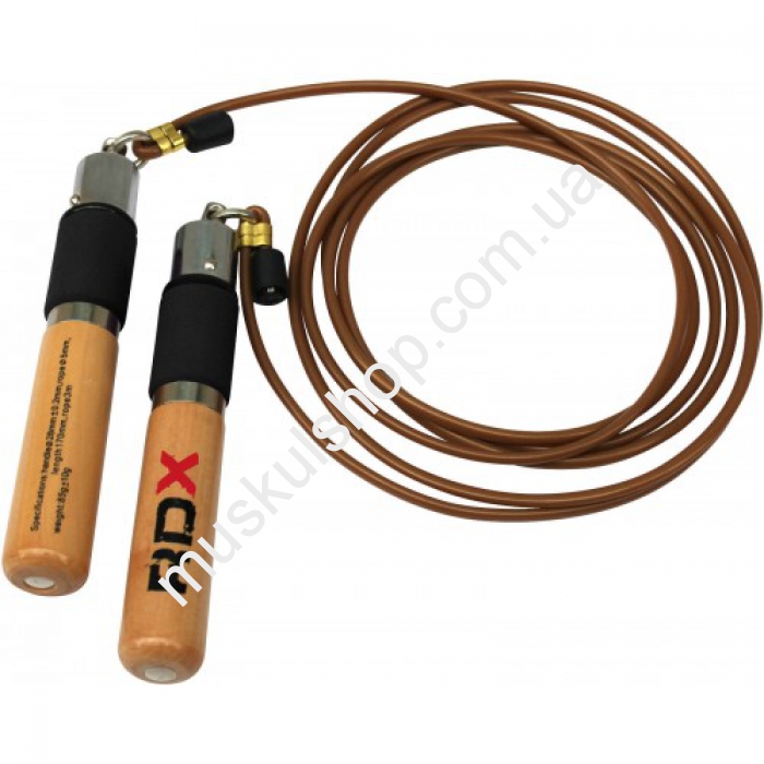 Скакалка RDX имеет высокую скорость вращения, это обеспечивается шариковыми подшипниками в ручках данной модели. Модель способна вращаться со скоростью свыше 5 оборотов в секунду, представлена в красном и черном цвете, выполнена из силикона, оснащена деревянными рукоятками. Изделие пользуется большей репутацией среди спортсменов и комплектуется всем необходимы сертификатами международного качества. Общая длина составляет 280 см. Занятий с таким инвентарем развивают у боксеров и других бойцов координацию движений, тренируют сердце, общий уровень выносливости организма, а также укрепляют мышцы групп ног и рук, грудной клетки и пресса. С целью тренировки кистей рук, внутри ручек предусмотрены специальные утяжелители.