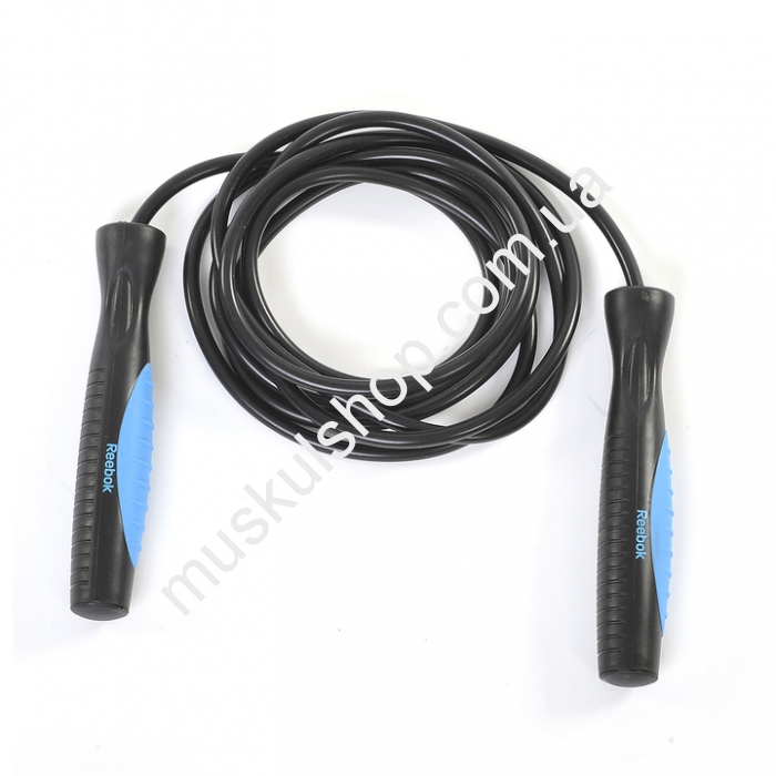 Скакалка Reebok отличается нескользящими, эргономическими ручками, общая длина скакалки составляет 2,8 м, модель выполнена в черном цвете с голубыми ручками. На ручках предусмотрено рельефное нанесение и фирменный логотип, чтобы они не выскальзывали во время интенсивных тренировок, скалка рассчитана на профессионалов. Подшипники нивелируют запутывание скакалки в момент прыжков, она регулируется по длине. Данный инвентарь увеличивает ловкость рук, скорость мышц, эластичность и повышает выносливость организма. В момент тренировки задействованы много групп мышц, такие как брюшного пресса, ягодиц, кисти рук, ладони, икроножные и спинные. Модель рассчитана на профессиональных пользователей.