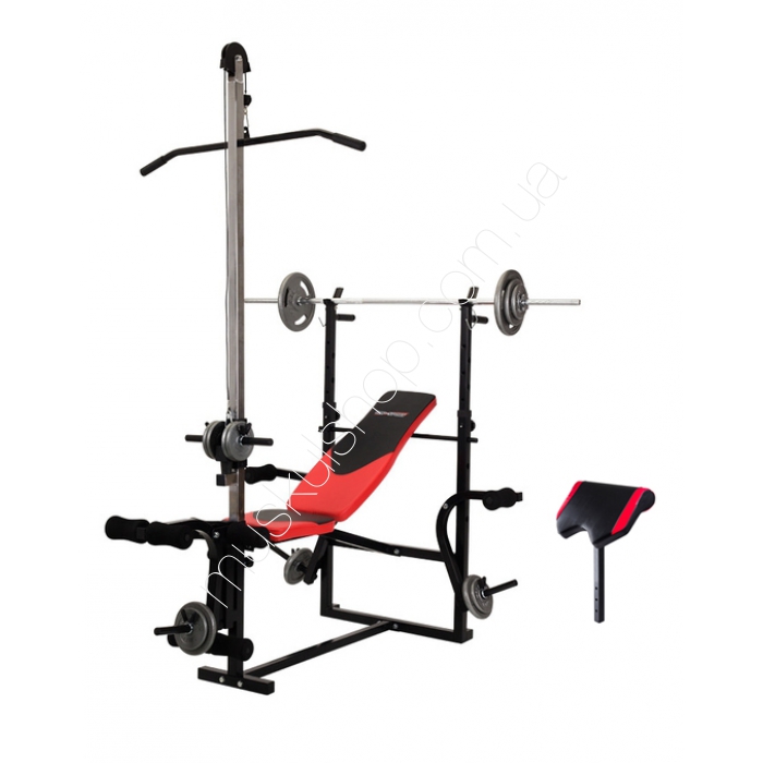 Hop-SportСкамья с верхней тягой и партой Hop-Sport HS-1070Скамья с верхней тягой и партой Hop-Sport HS-1070 относится к тренажерам, что разработаны специально для отработки горизонтального жима и жима под углом. Небольшие подпятники, что размещены на ножках оборудования, не только обеспечивают устойчивость скамьи, но и служат как компенсаторы неровности напольного покрытия. Конструкция оборудования покрыта порошковым напылением из краски, что придает устройству более солидный вид и позволяет защитить изделие от царапин. С целью создания необходимых условий для комфортного хранения и эксплуатации силовая скамья оснащается фиксаторами для грифов. Скамья с верхней тягой и партой Хоп-Спорт ХС-1070 это устойчивая и прочная сложная конструкция, в основе которой используется рама из стали, что способна выдерживать нагрузку с весом пользователя и с грузами. Общие габариты данной установки позволяют провести её размещение даже в небольших помещениях, а потому она подойдёт и для домашней эксплуатации.