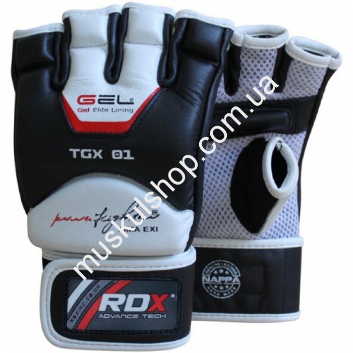 Перчатки RDX выполнены из качественной, прочной и эластичной кожи типа Nappa, модель защищает большой палец. Наполнителем является интегрированный гель с пеной, это позволяет амортизировать сильнейшие удары, защищает руки бойца от внезапных ударов. Фиксируются перчатки благодаря прочным липучкам, не слетают даже с узкого запястья. Перчатки полностью соответствуют заявленным международным стандартам, представлены в черно-белом цвете. Абсорбирующая ткань выводит лишнюю влагу с ладоней на руку. Битки широко применяют для отработки всех видов ударов в спарринге и на спортивных снарядах, например на боксерской груше, полностью исключая риск, получения различных травм.