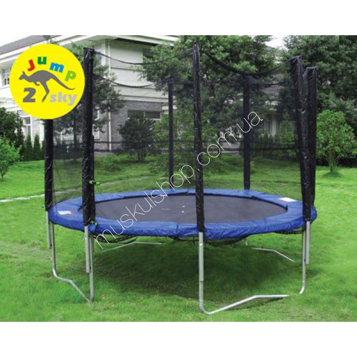 Батут Jump 2 Sky спортивного типа представлен в синем цвете, с черной прочной сеткой по бокам. Высота батута до начала мата 65 см, чтобы не поранить ноги в момент интенсивных прыжков. Мат выполнен из качественного, прочного и эластичного полипропилена. Вес вместе с упаковкой более 50 кг, а сам батут способен выдерживать нагрузку до 150 кг, идеально подойдет всей большой компании. Диаметр батут свыше 3 м, он устанавливается под открытым небом, на даче, у пляжа либо возле речки. Игры на таком батуте укрепляют иммунитет детишек. Малыши оценят игру на батуте, игры на нем очень полезные, а также способны принести много ярких и положительных эмоций и заряд бодрого настроения на весь день. Материал из которого выполнен батут, прочная и качественная сталь.