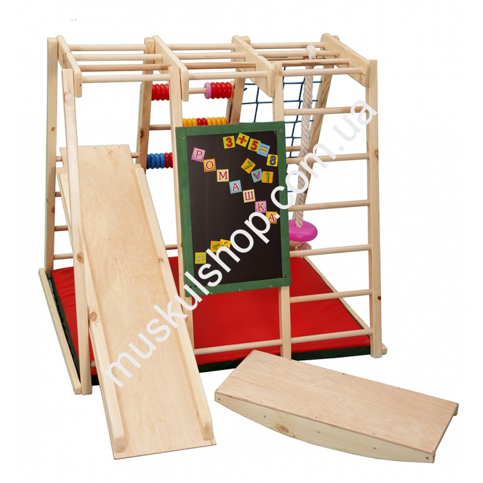 Детский домашний спорткомплекс Sportbaby Ромашка комплектуется матом для упражнений, детской горкой для спуска, шведской и гладиаторской стенкой, рукоходом, кольцами, качелями и столом, одним словом полностью подходит под маленький замок. На комплексе можно заниматься от года до шести лет. Комплекс выдерживает нагрузку до 40 кг, при этом масса самого изделия не превышает 30 кг. Уголок выполнен из сосны и бука, представлен в цвете натурального дерева. Комплекс хорошо развивает руки малышей, укрепляет их мышцы, а также поднимает иммунитет и выносливость. Конструкция очень устойчива и безопасная, а для производства комплекса применялись только экологически чистые материалы.