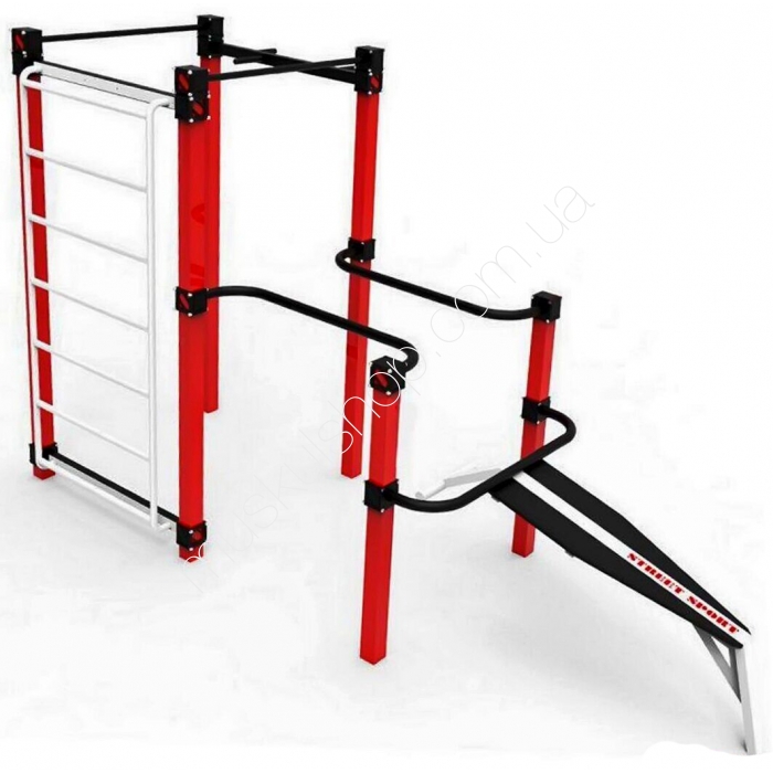 StreetSportСпортивный комплекс StreetSport SI-1Спортивный комплекс StreetSport SI-1 станет незаменимым во время проведения интенсивных тренировок по воркауту на свежем воздухе. Представленный тренажер поспособствует выполнению ряда элементов на самых различных элементах, что входят в его конструкцию. Специальная краска, которой окрашены все компоненты комплекса, не боится влаги, а потому не позволяет коррозии появляться на каркасе. Спортивный комплекс СтритСпорт СИ-1 это оборудование для спорта, которое наверняка понравится не только взрослым пользователям, но и более молодому поколению спортсменов. Для установки представленного комплекса вам необходимо вкопать его в землю, или забетонировать, дабы предать лучшей устойчивости. Спортивный комплекс прекрасно подойдет для размещения на различных площадках и стадионах, а также просто на улице возле жилого дома.