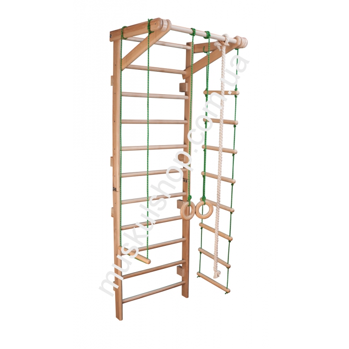 Детский спортуголок Sportbaby Растишка 2-230 стенка с турником, канатом, трапецией, кольцами, крепежным комплектом, а для безопасности купите мат. Уголок выполнен полностью из бука, включая перекладины, весьма надежный и безопасный. На комплексе также можно заниматься взрослым, он способен выдерживать вес свыше 100 кг. Детский спортивный уголок порадует абсолютно любого малыша своим особым дизайном, многофункциональностью. Комплекс выполнен в цвете натурального дерева, очень оригинально и красиво. Изделие обработано антисептиком, не втягивает влагу. Монтируется уголок к стенке, очень просто, нет ничего сложного. Комплекс не занимает много места в комнате.