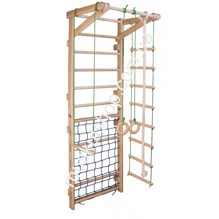 Детский спортуголок Sportbaby Растишка 2 в 1 комплектуется сеткой для юного гладиатора, стенкой с турником, канатом, трапецией, кольцами, крепежным комплектом, а для безопасности купите мат. Занятия на комплексе начинают проводить, когда малышу исполнится годик. Он монтируется уголок к стенке, очень просто, нет ничего сложного. Комплекс занимает мало места в комнате. Комплекс выполнен в цвете натурального дерева, очень оригинально и красиво. Изделие обработано антисептиком, не втягивает влагу. Подпора под турник способна выдерживать большой вес, а именно свыше 100 кг, такого турника хватит ему на всю жизнь. Вес комплекса не превышает 30 кг, порадует детишек особым дизайном, многофункциональностью.