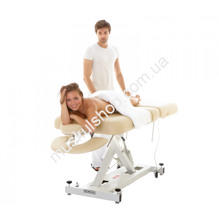 Us Medica Profi состоит из трех регулируемых секций, третья секция регулируется по высоте. Стол оснащен гибкими подлокотниками, двумя съемными подголовниками, полочкой для рук, круглыми бортами, а для удобства перемещения массажного стола предусмотрены колесики. Данная модель способна выдержать нагрузку в 190 кг. Изюминкой стола является электрический привод для подъема стола, а также педаль для регулирования определенной высоты. Стол идеально подойдет пациентам, страдающих лишним весом, а также для людей с большим ростом. Покрытие стола сделано из качественного кожзаменителя. Стол выполнен из высококачественной сплава стали.