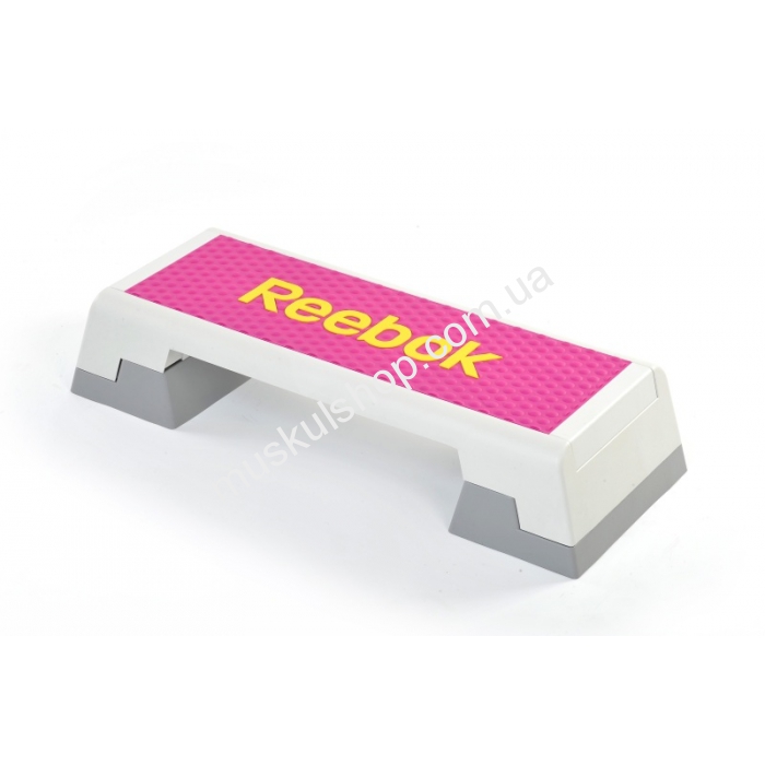 Степплатформа Reebok представлена в розовом цвете, посередине нанесен фирменный логотип спортивного бренда. Платформа способна выдерживать нагрузку до 120 кг, при этом ее вес едва превышает 7 кг, рассчитана на слабую половину нашего общества. Высоту можно отрегулировать на несколько уровней: от 15 до 25 см. Упражнения на таком спортивном инвентаре укрепят мышцы ног, сделают их упругими, эластичными, что приведет к наращиванию мышечной массы. Рассчитана модель на использование в домашних условиях. Маленькие шипы способны укрепить нервную систему человека через ступни ног. Инвентарь заменит беговую дорожку, а выполнен он из прочной, литой резины, с нескользящей резиновой, шипованной основой.