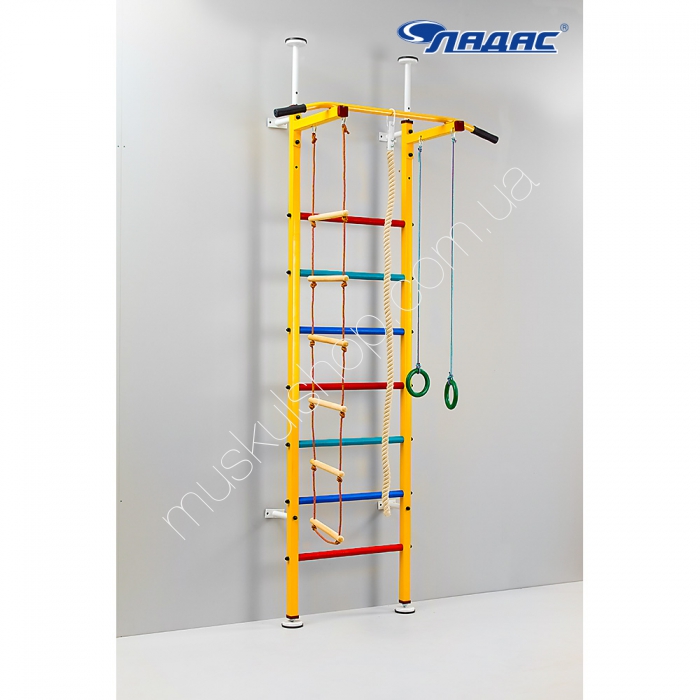 Металлическая стойка Ладас модель Киндер выполнена с прочного, качественного и надежного материала, комплектуется перекладинами разного цвета, обвитыми в эластичный пластиковые трубки, также в комплекте идет турник, широкого хвата, удобная лестница из веревки, прочный хлопчатый канат и гимнастические кольца. Стойка окажет положительное физическое влияние, поможет всегда быть в форме, поднять общий тонус организма. Модель способна выдерживать до 120 кг нагрузку, подходит не только детям, но и взрослым, представлена в разноцветном цвете. Такая стойка украсит детскую комнату, заставит детишек поддерживать в хорошей физической форме, получить море положительных эмоций.