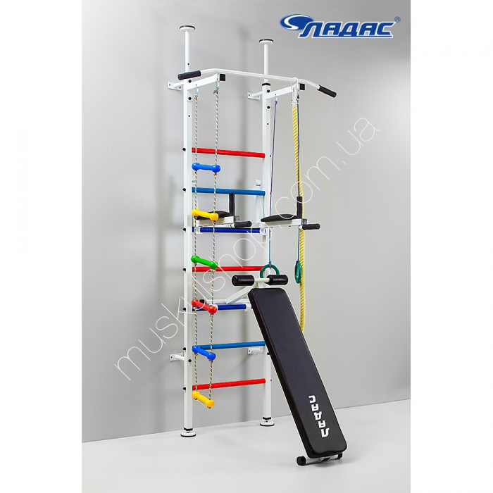 Стойка Ладас модель Чемпион крепиться не только к стене, но и к потолку, в результате чего конструкция очень устойчивая и безопасная. Такая стойка украсит детскую комнату, заставит детишек поддерживать в хорошей физической форме, получить море положительных эмоций. Модель способна выдерживать до 120 кг нагрузку, подходит не только детям, но и взрослым, представлена в разноцветном цвете. Стойка окажет положительное физическое влияние, поможет всегда быть в форме, поднять общий тонус организма, подкачать важные группы мышцы рук, шейного отдела, поясницы и пресса. Комплектуется всем необходимым: а именно, стенкой с перекладинами, прочным, широким турником, пиратской лестницей, прочным хлопковым канатом и гимнастическими кольцами. Изюминкой стойки является наличие лавки для качания пресса.