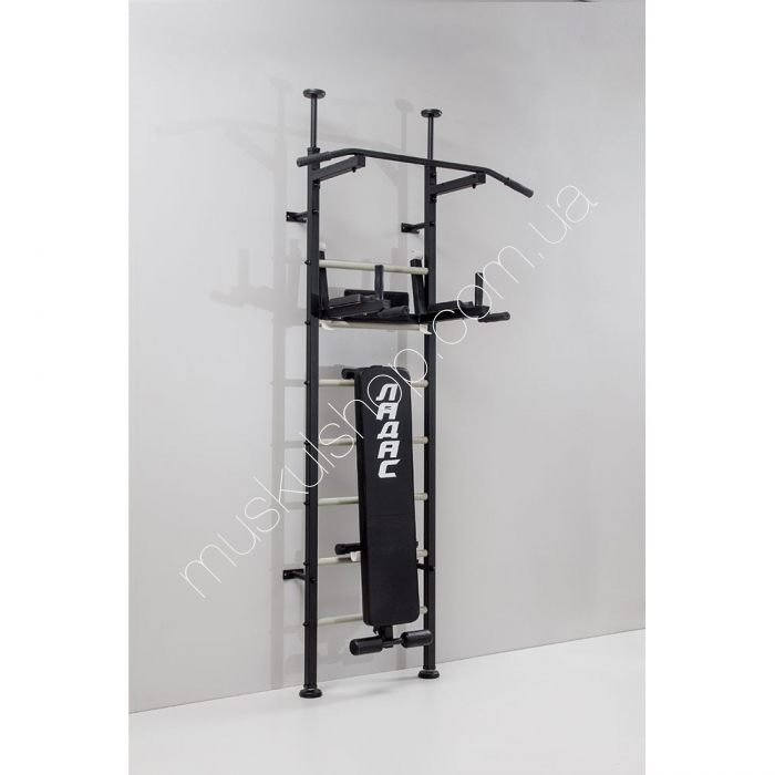 Стойка Ладас модель Energy выполнена с прочного металла, высшего класса, представлена в черном цвете, крепится распорками и к стенке одновременно. Стойка оказывает положительное физическое влияние, поможет всегда быть в форме, поднять общий тонус организма, подкачать важные группы мышцы рук, шейного отдела, поясницы и пресса. Модель способна выдерживать до 120 кг нагрузку, рассчитана исключительно на взрослых или на большую семью. Стойка помогает начинающему спортсмену выполнить разные физические упражнения, укрепить все мышцы торса спортсмена. Укомплектована модель стенкой с перекладинами, которые обвиты в пластмассовые трубки, широким, прочным и надежным турником, лавочкой для качания пресса, уникальными брусьями под штангу.