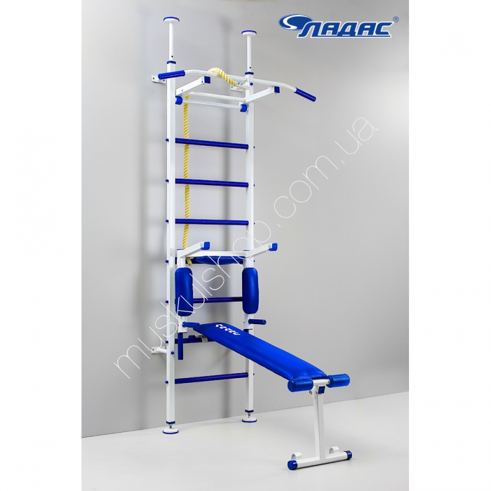 Стойка Ладас Одиссей отличается съемным турником с большим хватом, пиратской лестницей, прочным канатом, гимнастическими кольцами, лавочкой под пресс, стенкой с перекладинами и брусьями. Стойка поможет детям и взрослым научиться выполнять разные физические упражнения, накачать мышцы и поднять свой иммунитет. Стойка поможет поднять общий тонус организма, подкачать важные группы мышцы рук, шейного отдела, поясницы и пресса. Стойка бело-синего цвета способна выдерживать до 120 кг нагрузку, рассчитана исключительно на взрослых или на большую семью. Модель изготовлена с прочного, качественного металла, высшего класса, крепится распорками и к стенке одновременно.