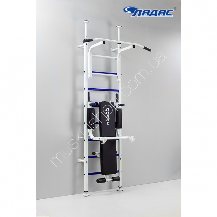 Стойка Ладас укомплектована навесными брусьями под штангу, а также стенкой с перекладинами из металла, обвиты в пластмассовые трубки, широким, прочным и надежным турником, лавочкой для качания пресса. Стойка помогает выполнять разные физические упражнения, укрепить все мышцы торса спортсмена. Модель крепится к стенке и потолку одновременно, обеспечивая прочную фиксацию, представлена в бело-синем цвете. Стойка оказывает положительное физическое влияние, поможет всегда быть в форме, поднять общий тонус организма, подкачать важные группы мышцы рук, шейного отдела, поясницы и пресса. Модель способна выдерживать до 120 кг нагрузку, рассчитана исключительно на взрослых или на большую семью.