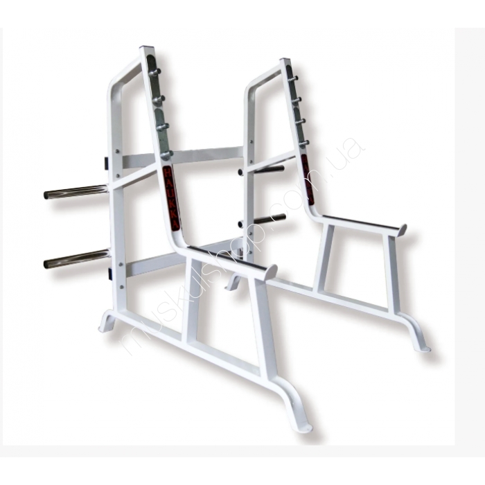 Тренажер имеет жесткую мощную конструкцию, необходимую для приседания с любыми весами. Крюки, удерживающие гриф, выточены из цельного металла и оцинкованы для износостойкости. Страховки выполнены нерегулируемой частью конструкции, для гарантии безопасности и имеют резиновую амортизирующую накладку, для сохранения внешнего вида. Имеются места для хранения блинов, выполнено из нержавеющей стали.