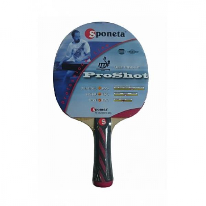 Ракетка Sponeta ProShot рассчитана на профессиональных игроков для различных соревнований. Ручка вогнутая, анатомической формы, не соскальзывает с ладони, плотно фиксируется. Ракетка сертифицирована по международным характеристикам – ITTF. Легкий вес ракетки, всего 120 г только придает ей маневренности. Изготовителем теннисной ракетки является известный немецкий концерн «Sponeta», это известный лидер среди теннисных столов, теннисных ракеток, а также других аксессуаров. Компания Спонета работает больше 50 лет и является мировым лауреат и победитель многих выставок, конкурсов и турниров. Не отказывайте себе в лучшем качестве, закажите профессиональные теннисные ракетки Sponeta в магазине!