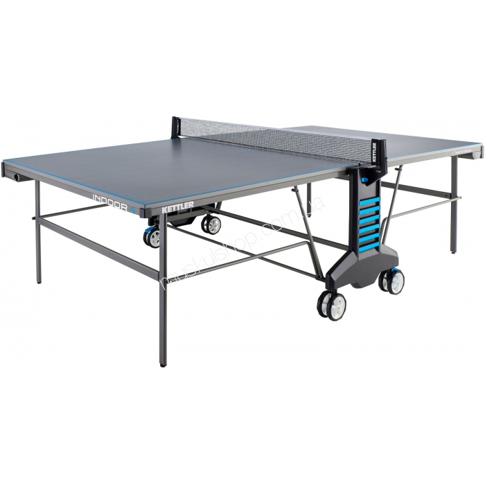 Стол Kettler теннисный модель Indoor 4 выполнен из плиты ДСП синего цвете, общей толщиной 19 мм, обладающей антибликовым покрытием. Все столы Кетлер производятся согласно немецкой технологии, имеют соответствующие сертификаты качества. Теннисный стол оснащен теннисной сеткой, съемного типа, с возможностью регулирования ее высоты и прочности натяжения. Внизу стола предусмотрены держатели ракеток и теннисных мячиков. Система транспортировки состоит из четырех роликов и двух тормозов, ролики поворачивают по ходу движения стола. Размеры стола стандартные, стол предназначен для игры в закрытых помещениях. Конструкция стола складная, состоящая из двух частей, складывает моментально.