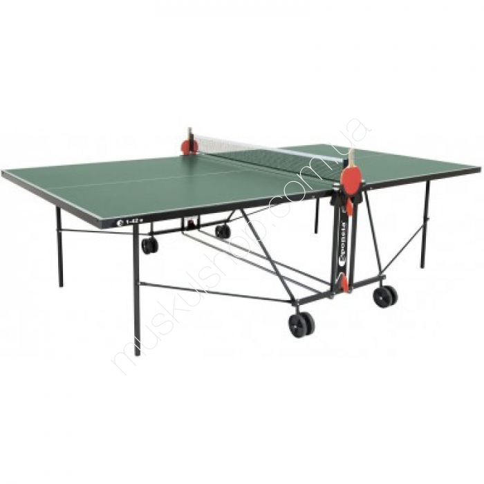 Теннисный стол Спонета С1-42 е оснащается компактной системы складывания, которая не только позволяет с лёгкостью хранить стол, но и позволяет поднять одну его сторону для тренировок на одного. Стол оснащён небольшой сеткой, которая позволяет полноценно провести любую тренировку и игру. Лёгкость в транспортировке обеспечивает наличие прочных колёсиков, которые беспрепятственно позволяют перевозить конструкцию. Металлическая окантовка столешницы не только обеспечивает прочность стола, но и исключает возможность получения травмы пользователем.