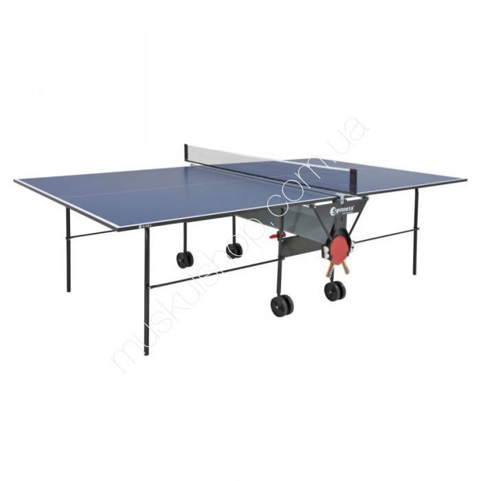 SponetaТеннисный стол Sponeta S1-13iСтол теннисный Sponeta S1-13i - отличный складной теннисный стол для игры в закрытых помещениях. Каждый, кто играл в настольный теннис, никогда не забудет увлекательности и азарта этой игры. А сколько радости, бодрости и положительных эмоций приносит этот простой и доступный вид прикладной игры. В качестве материала для стола используется специально обработанная древесностружечная плита (ДСП) толщиной 19 мм, что обеспечивает очень хороший отскок мяча во время игры. На ДСП нанесено специальное антибликовое покрытие. Стол легко перемещается на 4-х колесах диаметром 125 мм, два колеса - маневренные. Конструкция стола позволяет тренироваться в одиночку.