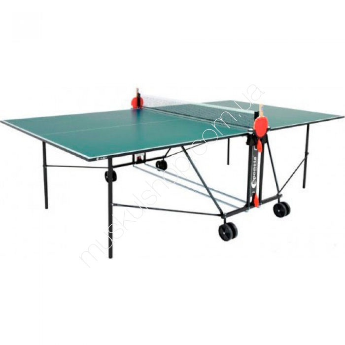 Стол для использования в закрытых помещениях. Это складная модель, что обеспечивает удобство ее хранения и применения в домашних условиях. Игровая поверхность выполнена из специально подготовленной панели, толщиной 19 мм. Каркас выполнен из черного металла, профили округлой формы диаметром 25 мм. Стол оснащен 4 транспортировочными колесами диаметром 125 мм, что существенно облегчает транспортировку оборудования при необходимости. В комплект также входит сетка, держатель для ракеток и мячей.