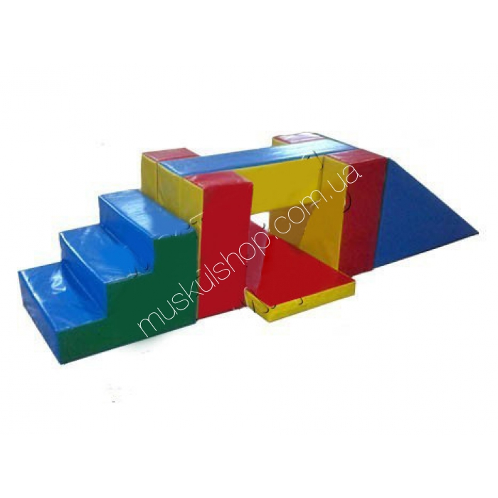 Детский тренажер состоит из 6 модулей. Для безопасности модули имеют места скрепления между собой. Возможны любые цветовые решения и изготовление модулей по индивидуальным размерам.