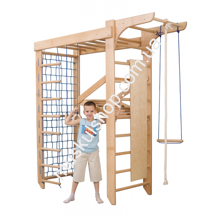 Детский спортуголок Sportbaby Bambino 5-240 оснащен прочным рукоходом, выполненного из бука. Также уголок комплектуется гладиаторской сеткой, трапецией, канатом, стенкой с турником, съемным турником, доской для пресса, крепежным комплектом, веревочной лестницей, а для безопасности купите мат. Выполнен комплекс из прочного бука, в цвета натурального дерева. Вес комплекса не превышает 55 кг, порадует детишек особым дизайном, а способен выдерживать нагрузку до 130 кг. Комплекс не займет много места в комнате, крепится к стенке, нет ничего сложного, в такой схеме разберется любой взрослый. Приучайте ребенка к спортивным снарядам с раннего возраста. Комплекс развивает все группы мышц ребенка, повышает выносливость, развивает качества лидерства, тренирует гибкость и многое другое.