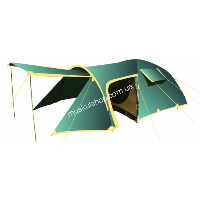 Палатка Tramp комплектуется дополнительно двумя стойками. В палатке предусмотрены вентиляционные клапана, огромное спальное отделение с вентиляционными окнами, а все швы палатки хорошо пропитаны клеевой основой. Палатка обладает длиной в 4,8 м и шириной 2 м, способна вместить четверых туристов. В модели предусмотрено несколько окон для обзора, огромная юбка по периметру конструкции, москитная сетка на входе во все спальные отсеки модели. Тент палатки пошит с прочного, дышащего и не продуваемого полиэстера с добавлением армированного полиэтилена. Оснащена модель тремя входами, выполнена в желто-зеленом цвете, вес которой всего 8,9 кг, фиксируется от опрокидывания металлическими колышками, очень удобная, комфортная, каркас изготовлен из дюрапола и 16 мм стали.