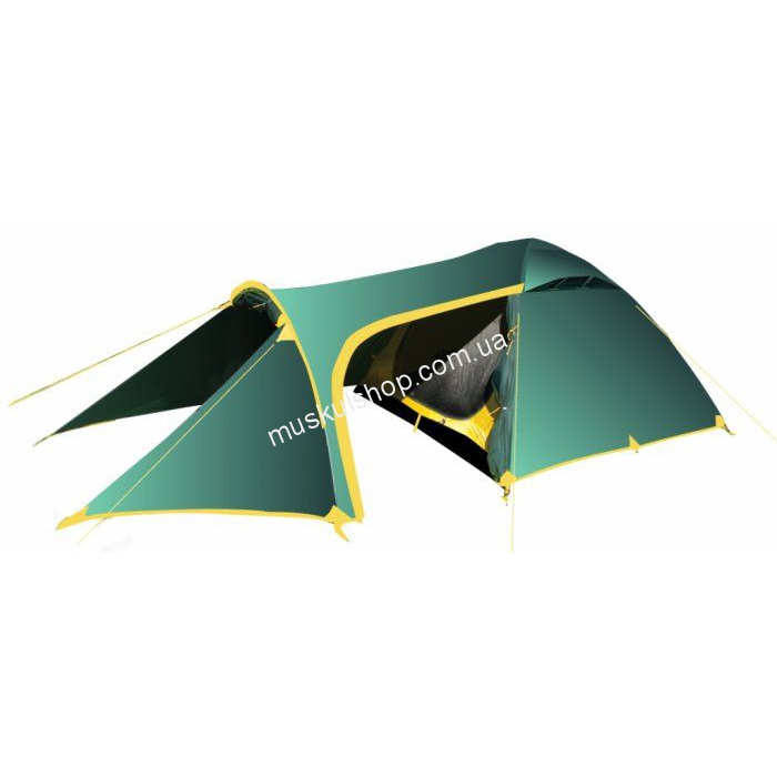 Палатка Tramp оснащена тремя входами, модель выполнена в желто-зеленом цвете, вес которой всего 5,6 кг, фиксируется от опрокидывания металлическими колышками, очень удобная, комфортная модель выполнена с 8,5 мм дюрапола, новейшего сплава. В палатке предусмотрены вентиляционные клапана, огромное спальное отделение с вентиляционными окнами, а все швы палатки хорошо пропитаны клеевой основой. Палатка обладает длиной в 4,4 м и шириной 2 м, способна вместить троих туристов. В модели предусмотрено несколько окон для обзора, огромная юбка по периметру конструкции, москитная сетка на входе во все спальные отсеки модели. Тент палатки пошит с прочного, дышащего и не продуваемого полиэстера с добавлением армированного полиэтилена.