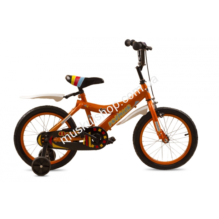 Велосипед Premier модель Bravo представлен в ярком оранжевом цвете. Для защиты детских ножек, крепится к раме защита от цепи, а педали модели вылиты из прочного пластика. Рассчитан на детей в возрасте от 4-х лет и старше. Велосипед выделяется ярким дизайном и выразительной окраской. Колеса 16 дюймов, окрашенные в оранжевый цвет. Каретка от американского производителя. Укомплектован всем необходимым, а именно: задним и передним щитком, защитой цепи, широким и комфортным седлом, передний тормоз ручной, задний барабанный, зажимается в обратную сторону. Комплектуется одной скоростью, рама выполнена из стального сплава, модель городского цикла, а для полной устойчивости предусмотрены боковые, съемные колеса и комплект новых крыльев.