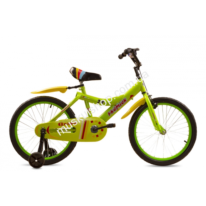 Велосипед Premier модель Bravo комплектуется двойной тормозной системой, впереди стоит ручной тормоз, а сзади – барабанный тормоз, который приводиться в действие путем зажимания в противоположную сторону. Педали модели изготовлены из прочного пластика. Кроме этого велосипед комплектуется комфортным седлом, внушительных размеров. Колеса модели, окрашенные, а каретка от американского производителя, надежная и безотказная. Рама изящная, изогнутая, она составляет 20 дюймов и произведена из стального сплава в цвете лайм. Рассчитан велосипед на детишек 6-летного возраста. Для защиты детских ножек, крепится к раме защита от цепи, а педали модели вылиты из прочного пластика. Комплектуется одной скоростью, назначение для городского цикла, а для полной устойчивости предусмотрены боковые, съемные колеса и комплект новых крыльев.