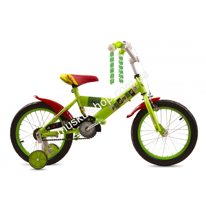 Велосипед Premier модель Enjoy представлен в стильной, слегка изогнутой 14 дюймовой раме, выполненной из стали, цвета лайм с красными крыльями. Оснащен велосипед одной скоростью, назначение для городского цикла, а для полной устойчивости предусмотрены боковые, съемные колеса. В ручках велосипеда размещены букеты из бусинок, хорошо подойдут маленьким четырехлетним девочкам. Система торможения состоит из переднего ручного и заднего барабанного тормоза, который приводиться в действие путем зажимания в противоположную сторону. Для защиты детских ножек, крепится к раме защита от цепи, а педали модели вылиты из прочного пластика. Кроме этого велосипед комплектуется комфортным седлом для путешествий. Колеса окрашенные, а каретка от американского производителя, надежная и безотказная. Модель также оснащена пластиковыми педалями, дополнительными колесами, крыльями и защитой цепи.