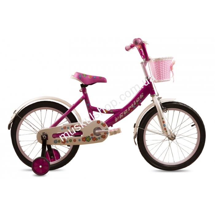Велосипед Premier модель Princess отличается от других стальными крыльями, а также надежными тормозами, впереди установлен тормоз типа V-Brake, а сзади предусмотрен барабанный тормоз, который приводиться в действие путем зажимания в противоположную сторону. Велосипед односкоростного типа, а для полной ее устойчивости предусмотрены боковые колесики. Укомплектован велосипед прочными надувными колесами, с окрашенным розовым ободом. Представлена модель в 18 дюймовой стальной раме, розового цвета. Также для защиты ножек детей предусмотрен безопасный чехол на цепь, а для полного комфорта впереди руля размещена корзинка для перевозки вещей. Отличается модель комфортным седлом для путешествий, а также прочной и надежной американской кареткой.