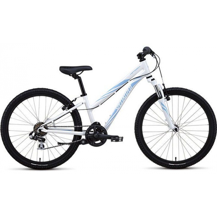 Колесо:24 " Материал рамы: алюминиевый сплав Тип вилки: пружинно-эластомерный Вилка: SR Suntour Тип тормоза: ободной, V-Brake Тип велосипеда: детский велосипед Пол: женский Количество скоростей: 7 шт. Обода: алюминий Руль: алюминий, гнутый Цвет: белый, фиолетовый Седло: Specialized, Kids