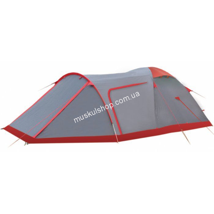Цвет: серый/красный Артикул: TRT-045.08 Материал каркаса: Алюминий 8,5 мм Размеры: 480х210 см Материал дна: полиэстер Материал внутри: полиэстер Материал тента: полиэстер Тип: экспедиционная палатка Количество входов: 3 Вес: 5,2 кг Количество мест: 3