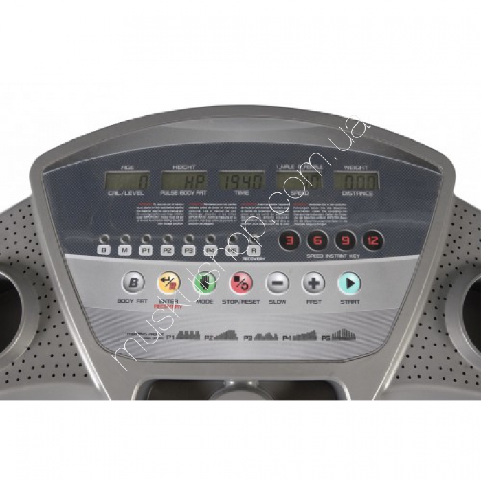 Показания дисплея: скорость, время, дистанция, калории, пульс, угол наклона